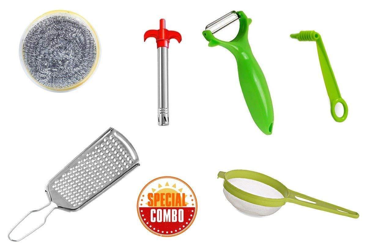Your Brand Mix Combo - Kitchen Scrubber, Gas Lighter, Vegetables Grater, Vegetable/Fruit Peeler, Vegetables Spiral Cutter/Spiral Knife and Big Tea Strainer Sieve (6pcs)