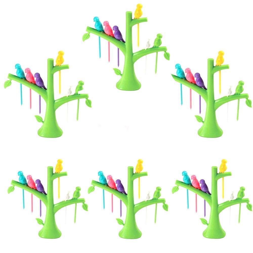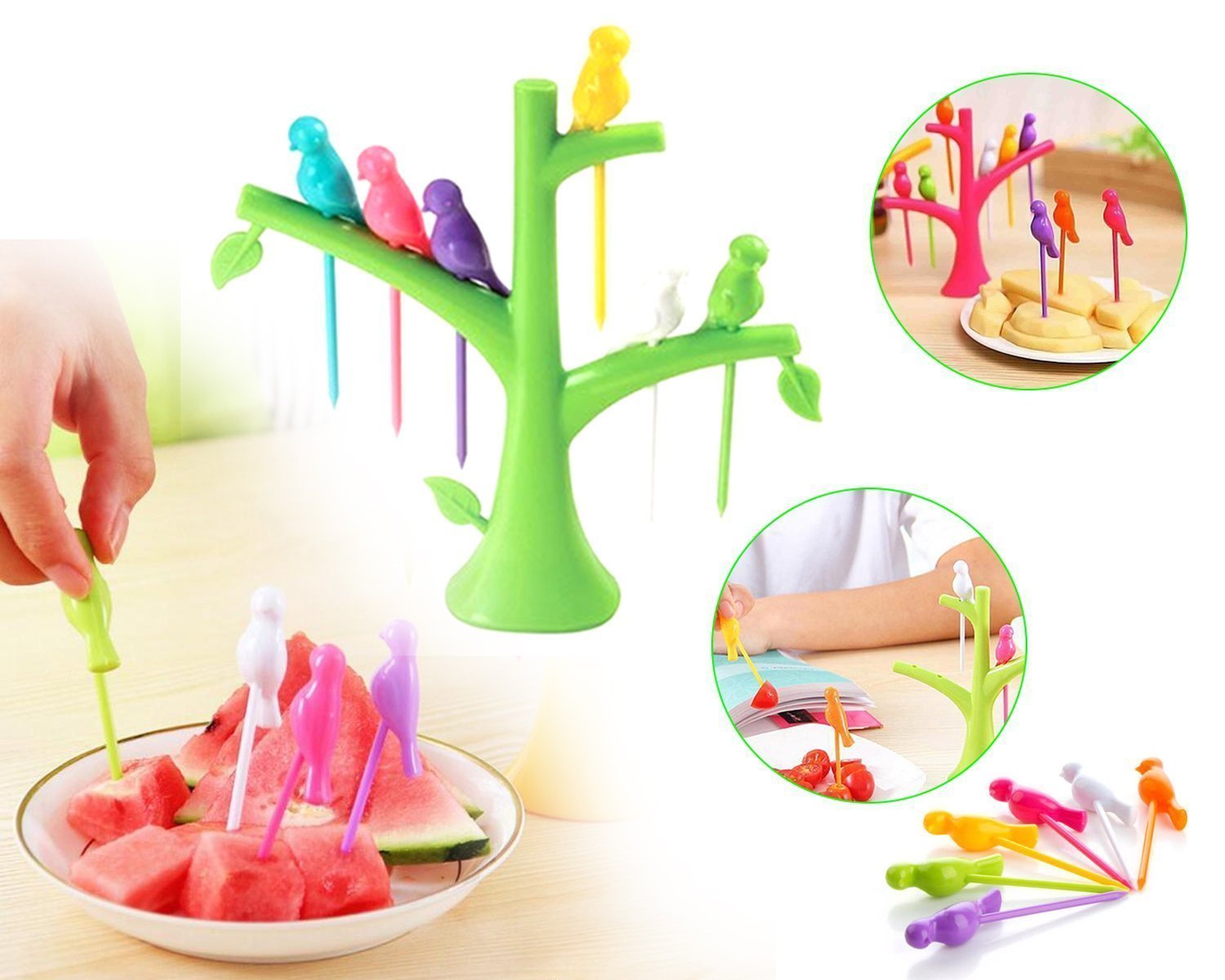 Bring home this Birdie and make your child fruit eating fun.Eat fruits without using hands with the help of this Bird shape fruit fork set. The set comes with six fruit forks with a stand. Made of high-quality food grade plastic.Being colorful, you will NOt mix these forks. When NOt in use, this fruit fork set makes a cute dining table decorative piece.The six forks come in the shape of Hummingbirds and the stand is shaped like a tree branch.