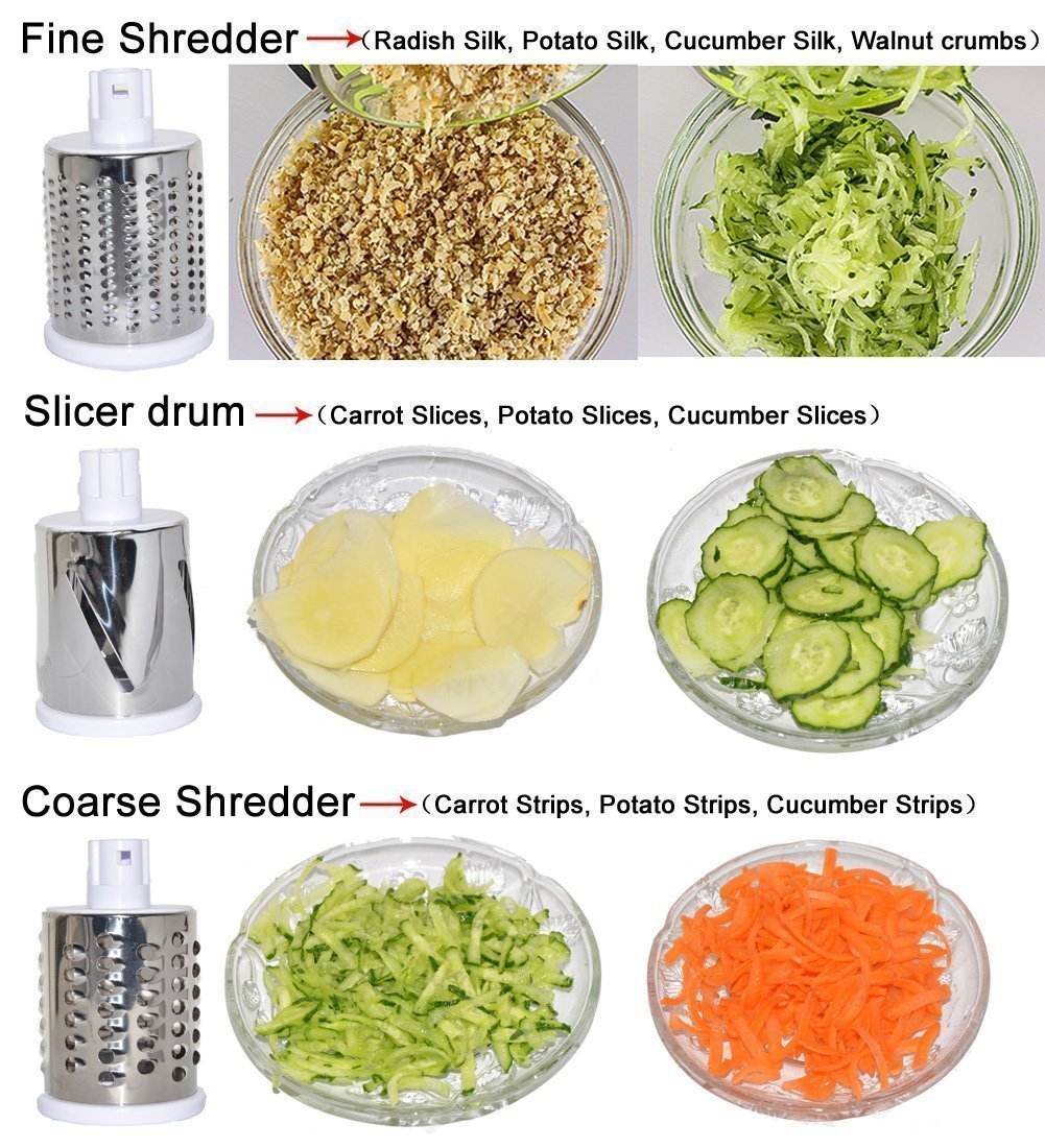 The drum greater can be used to shred or grate cheese, vegetable, chocolate and nuts, creating even slices, vegetable salads, different cuts and decorative riffles