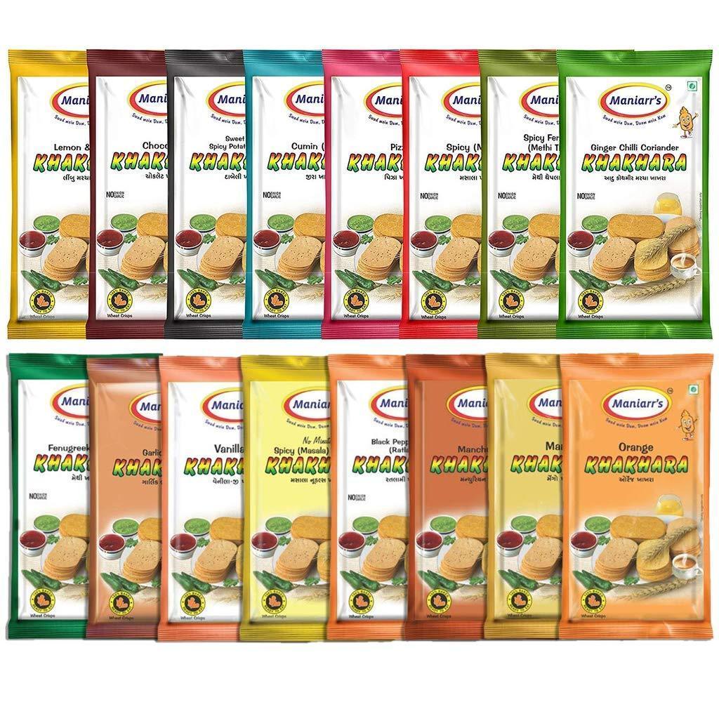 Khakhra Flavour A4-Combo include: Garlic Bread, Manchurian, Noodles, Ratlami, Methi, Vanila-G, Orange & Mango